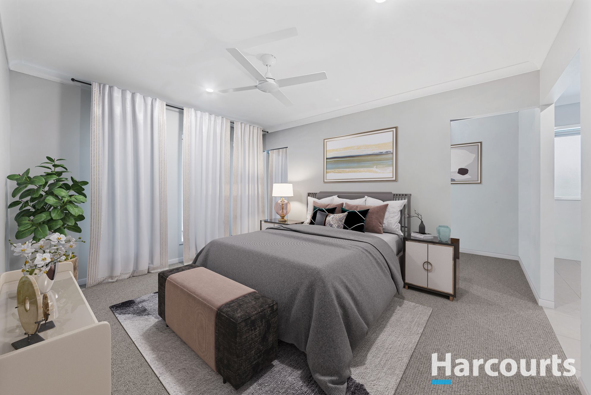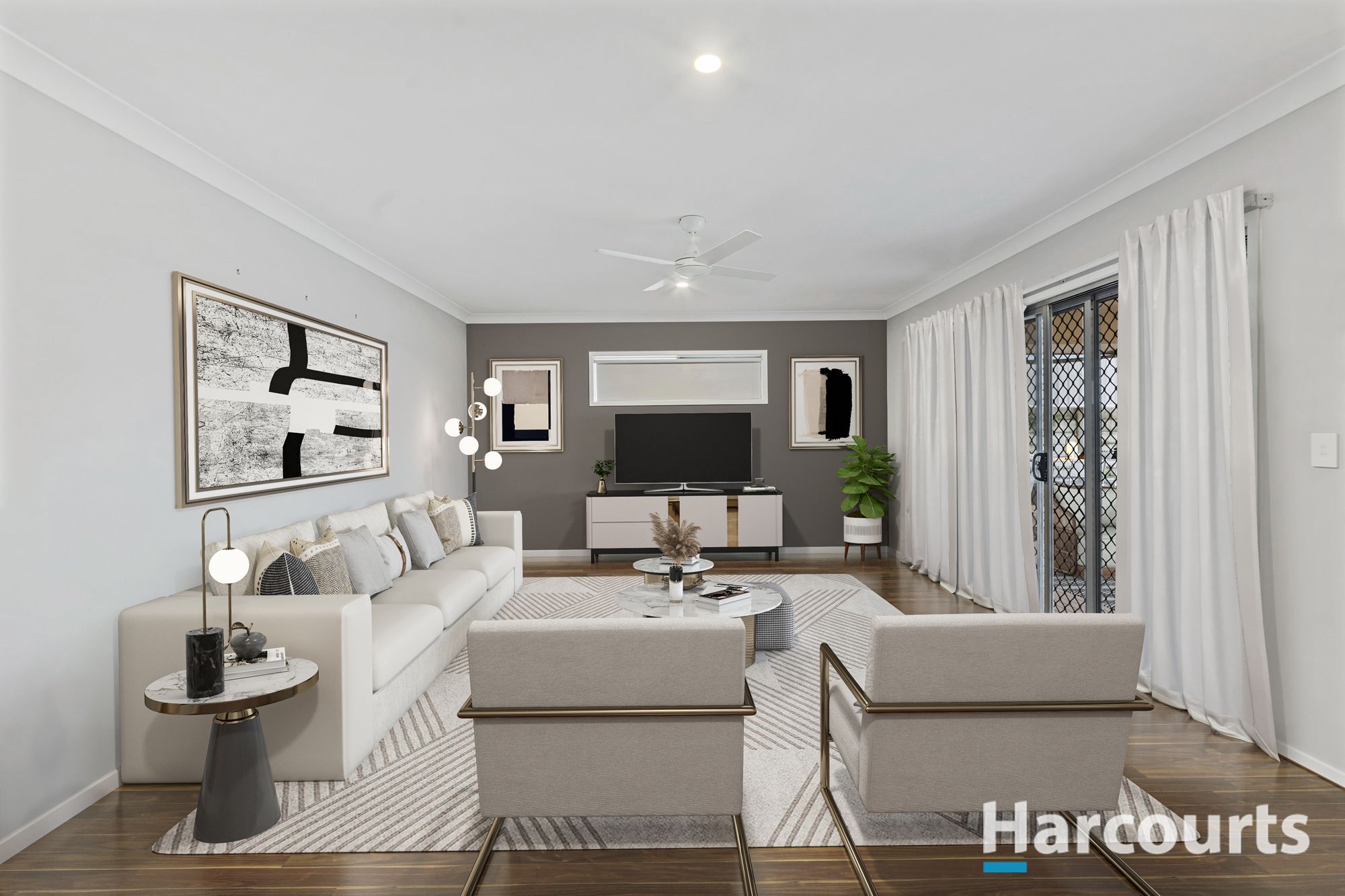 Inside, the home is adorned with stunning finishes in every room, complemented by air-conditioning and ceiling fans throughout for year-round comfort. The chef's delight kitchen boasts a walk-in pantry and modern appliances, making meal preparation a joy.