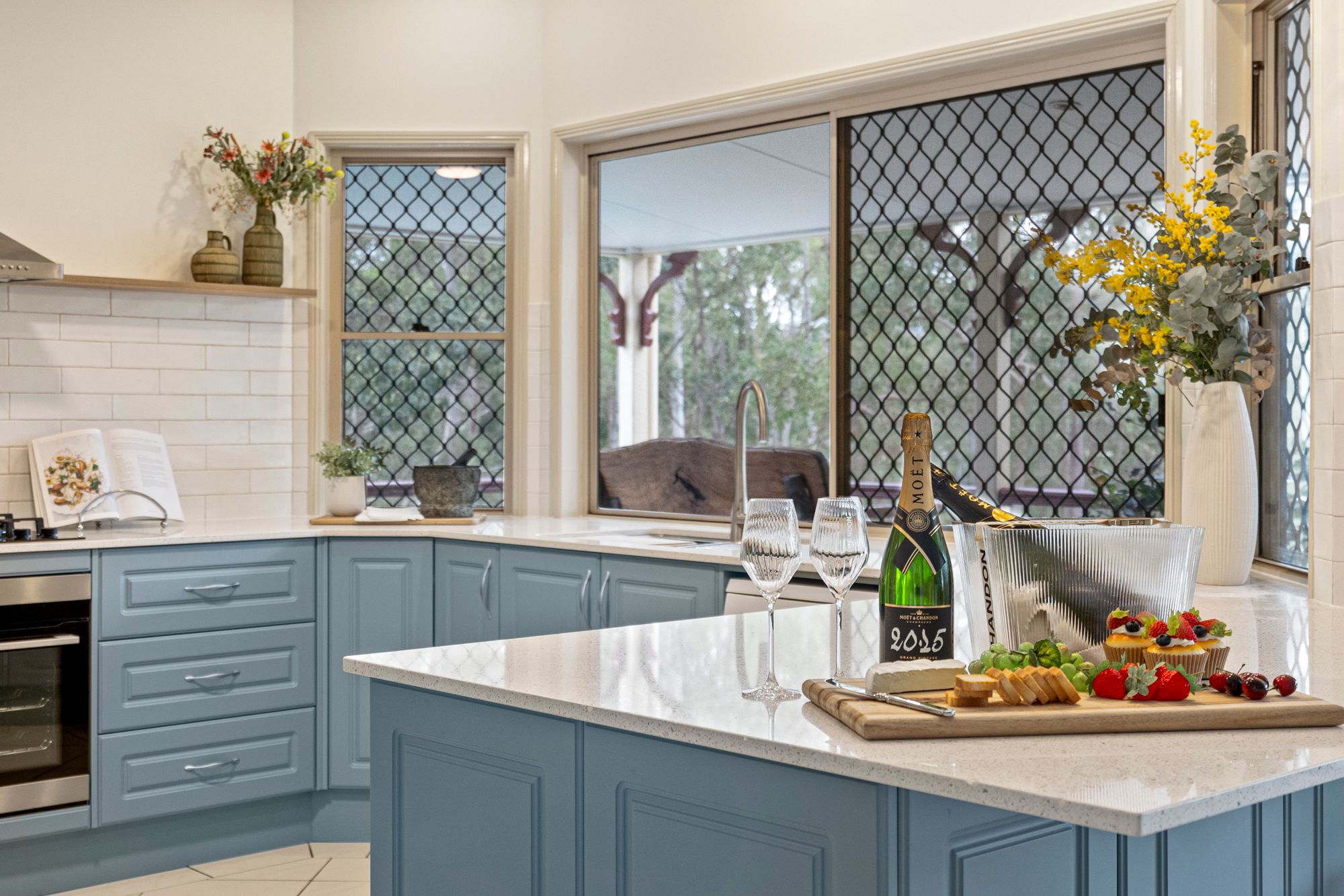 KITCHEN: - Full renovation by Kitchen Connection with sleek Spring Green cabinetry, Duckbill Satin Chrome handles, and Caesarstone (Nougat) benchtops - Soft-close drawers throughout, with integrated rubbish bin pull-out drawers - Premium appliances including a Fisher & Paykel gas-on-glass cooktop and 90cm AEG Pyrolytic under-bench oven - Under-mount sink with Essente stainless steel Goose Neck Mixer